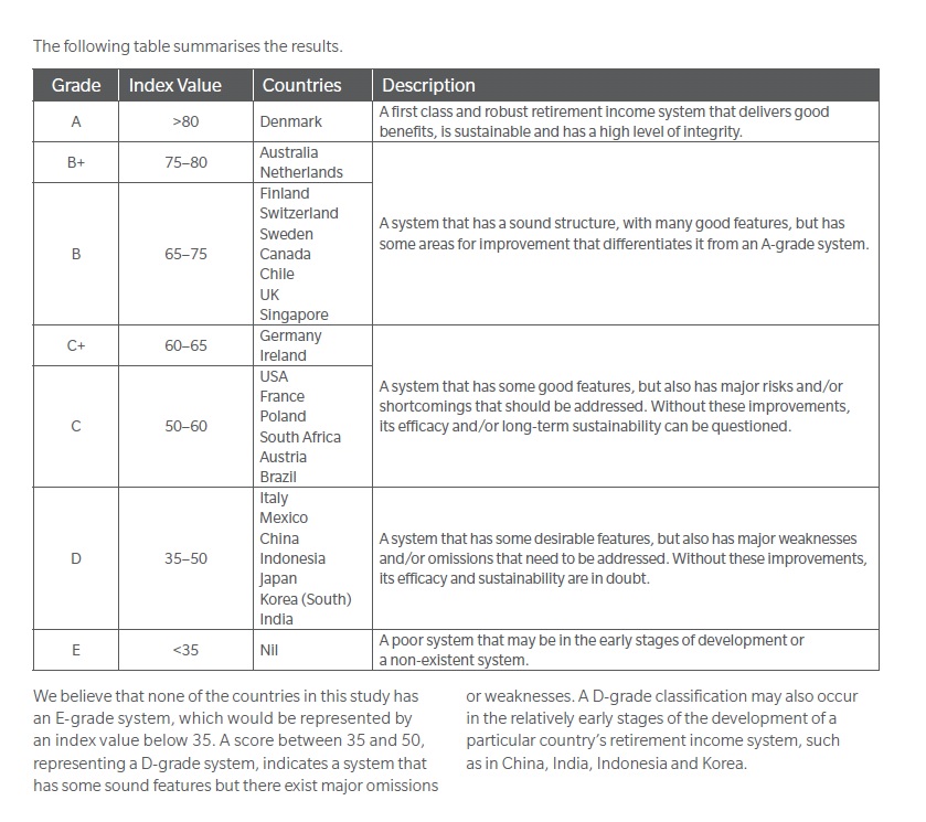 The Melbourne Mercer Global Pension Index (MMGPI) looks to rank country's retirement schemes and currently ranks Denmark at the top with an A rating. Australia and the Netherlands fit in just behind with most of the rest of the wealthier northern European countries not far below these top 3. Chile is somewhat of a surprise and achieves a high rating due to more to its structure than its current level of funding.