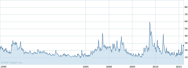 In general, the VIX runs counter to market returns. When the VIX is high, it is common for markets to be plummeting and when it is low it is common for markets to be trending slowly upwards. In October 2008, a month after Lehman Brothers filed for bankruptcy, the VIX hit an all-time, intra-day high of 89.53 (as shown by the spike in the above graph - weekly close of about 60). In normal market conditions, the VIX tends to sit around 15-20.